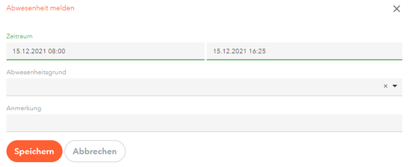 4. Ein neues Fenster öffnet sich. Nun können Sie Ihre Abwesenheit eintragen (Von/Bis Datum und Zeit, Abwesenheitsgrund und ev. Anmerkung). Schliessen Sie den Eintrag mit Speichern ab.