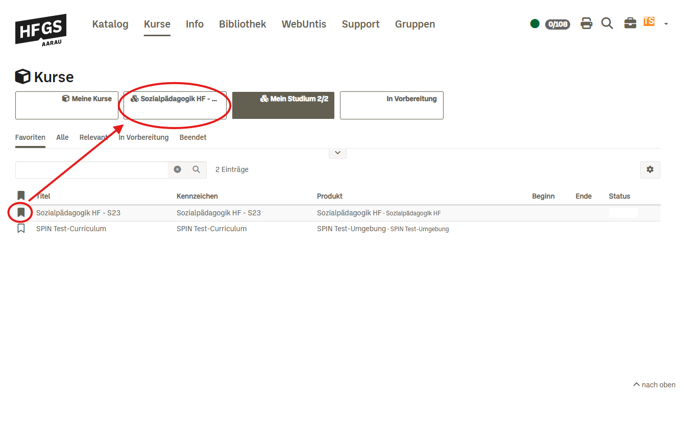 Wenn Sie Ihren Jahrgangskurs (S23, S24 oder S25) direkt anzeigen lassen wollen, können Sie dies über die Kennzeichnung als Favorit. Wenn Sie das Fähnchen anklicken, taucht unter Kurse direkt Ihr Jahrgangskurs auf: