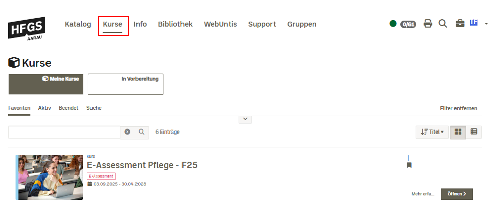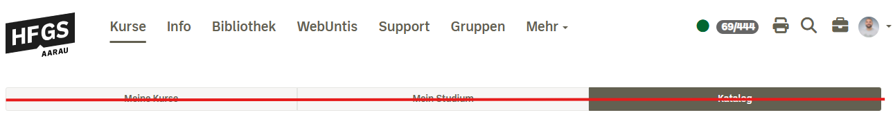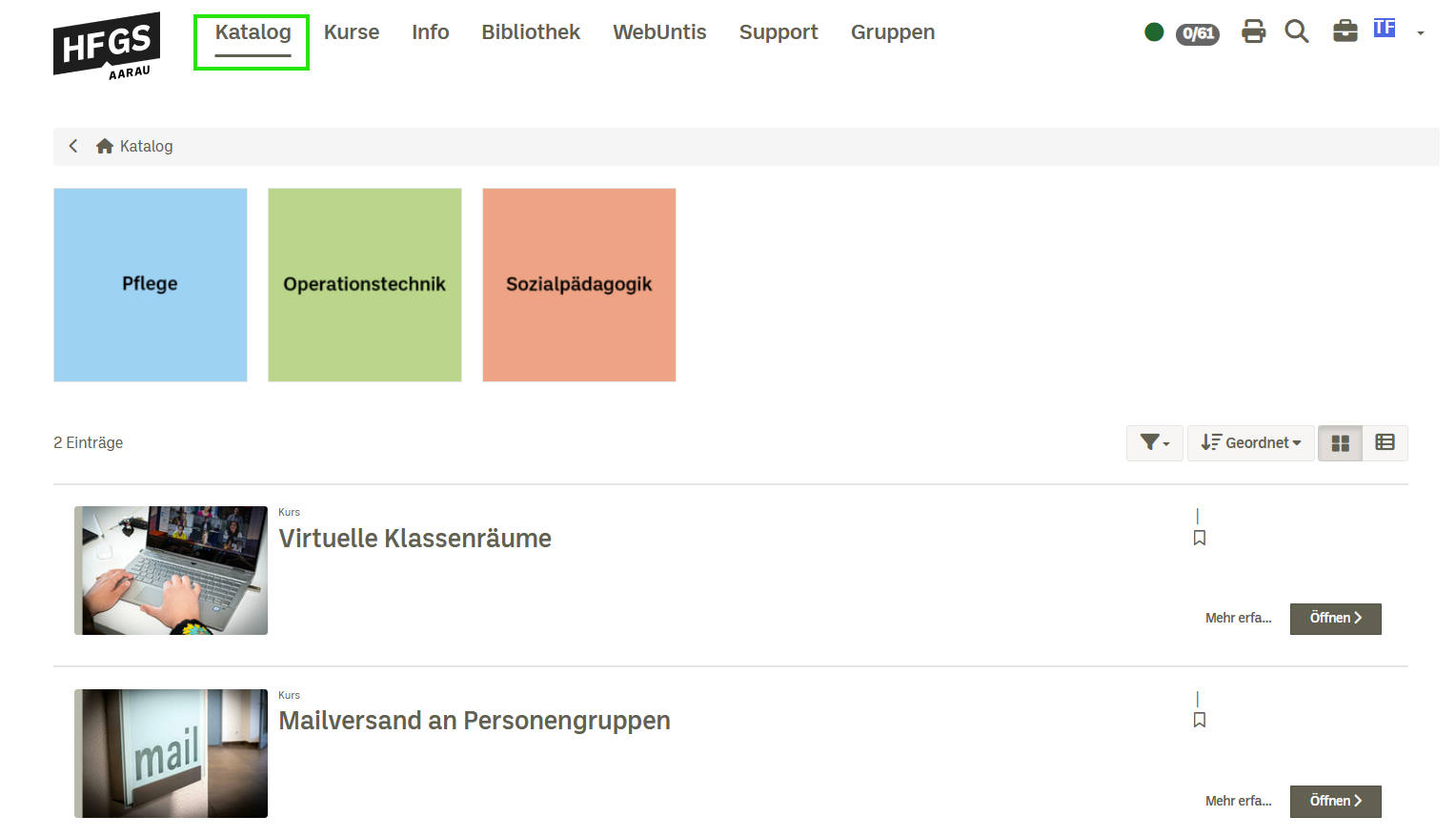 In den folgenden Bildern sehen Sie die NEUE Ansichten. Sie werden Ihre Kurse weiterhin entweder über den Katalog oder über den Reiter Kurse oben finden: