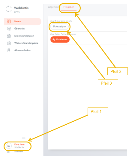 Danach klicken Sie im Browser unten links auf Ihr Profil (Pfeil 1). Klicken Sie auf das Register "Freigaben" (Pfeil 2) und dann auf "Anzeigen" (Pfeil 3). Mit dem QR-Code können Sie die App aktivieren und sind eingeloggt.